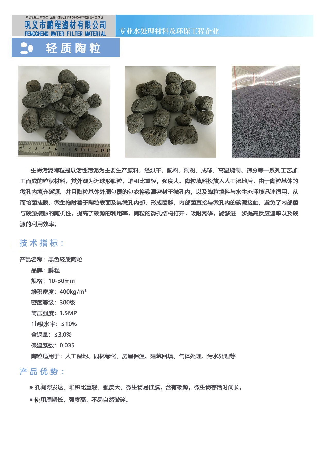 鞏義市鵬程濾材有限公司一家水過濾濾料 ——陶粒濾料生產(chǎn)廠家鵬程濾材陶粒濾料有黏土陶粒 生物陶粒 頁巖陶粒還有絢麗多彩的養(yǎng)殖花卉陶粒濾料。根據(jù)使用環(huán)境不同,陶粒產(chǎn)品齊全廠家歡迎您咨詢。