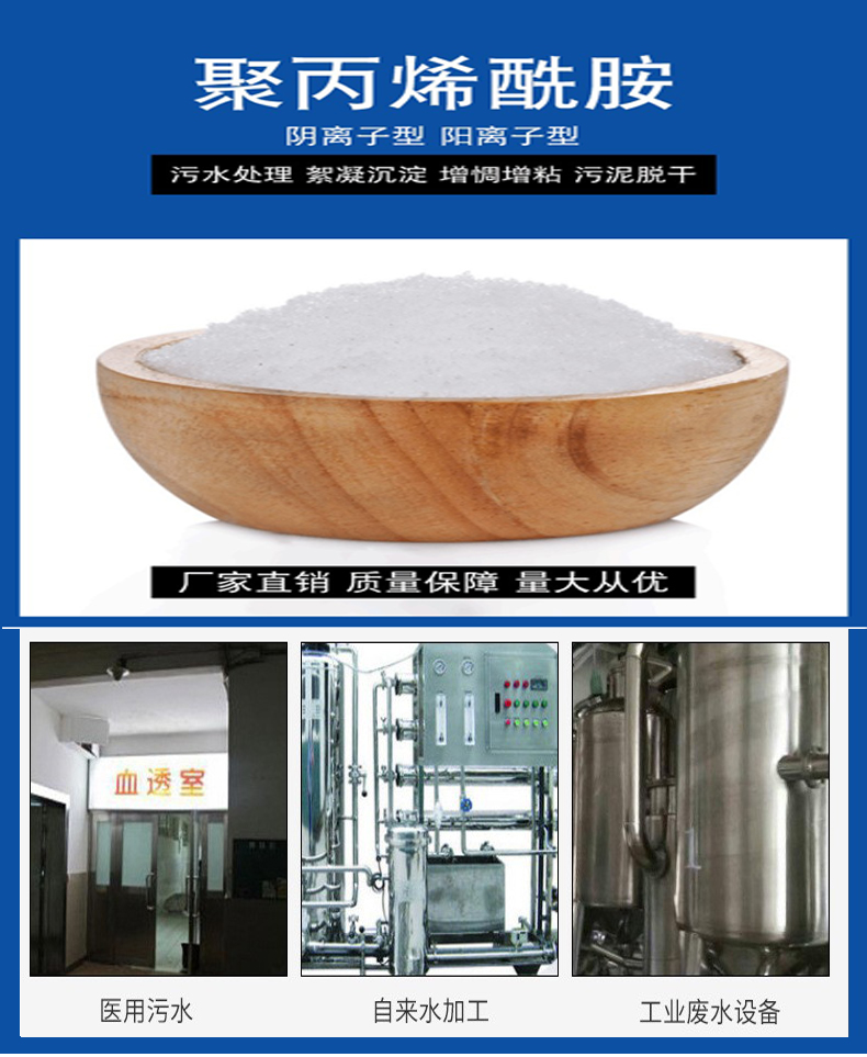 聚丙烯酰胺 有陽離子聚丙烯酰胺 陰離子聚丙烯酰胺 非離子聚丙烯酰胺。陰離子聚丙烯酰胺脫水效率高,泥脫水處理效率高。陰離子聚丙烯酰胺洗煤 洗砂絮凝效果快。非離子聚丙烯酰胺用途廣泛 使用范圍廣。