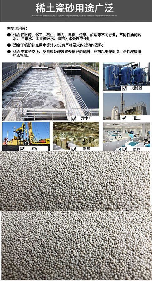 瓷砂濾料是一種球形顆粒,具有很好的穩(wěn)定化學性能,強度高,耐高溫 耐腐蝕比表面積大,截污吸附性能好,顆粒均勻,比重適中。稀土瓷砂濾料含油增強及耐腐蝕性的稀土,具有瓷砂濾料的性能外,吸附性能增強,化學穩(wěn)定性能好,適合做反滲透過濾和超濾介質(zhì)。 在單層濾池 雙層濾池 雙層過濾器,離子交換器等過濾上班中作過濾介質(zhì)及墊層,可以處理各種工業(yè)污水 工業(yè)用水 城市污水等。