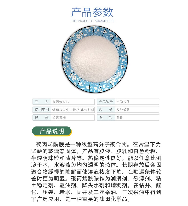 造紙助劑:在造紙工業(yè)中可用作紙張干強劑 助留劑 ,能極大的提高紙張質(zhì)量 節(jié)約成本,提高造紙廠的生產(chǎn)能力?梢灾苯优c無機鹽離子,纖維以及其它有機高分子發(fā)生靜電橋梁作用以達到增強紙張的物理強度,減少纖維或填料的流失。加快濾水 起到了增強  助留 助濾的作用,同時在脫模過程中起到了明顯的絮凝效果。